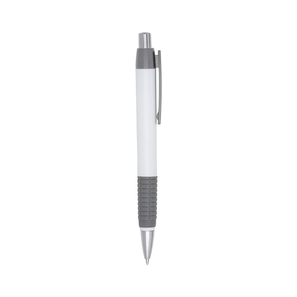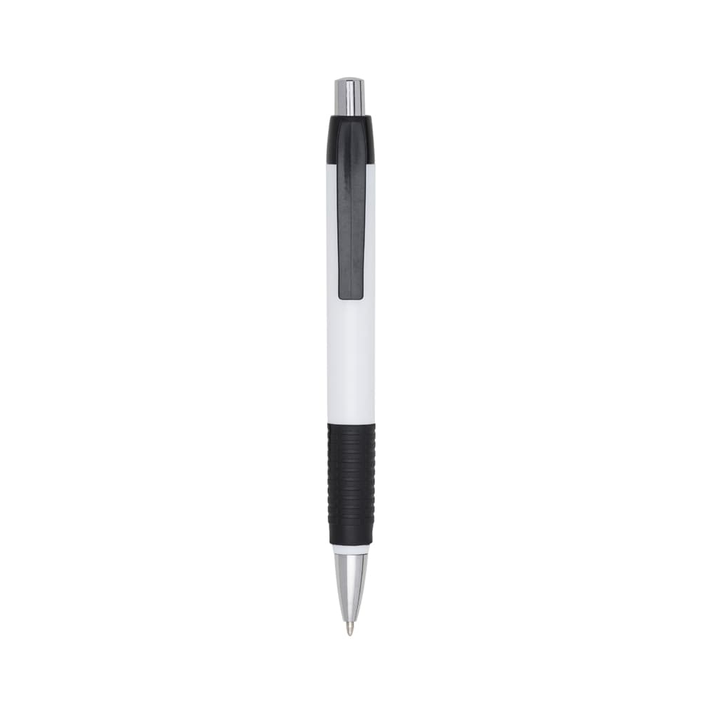 Caneta plástica com detalhe emborrachado, carga esferográfica azul 1.0 mm e acionamento por clique.
