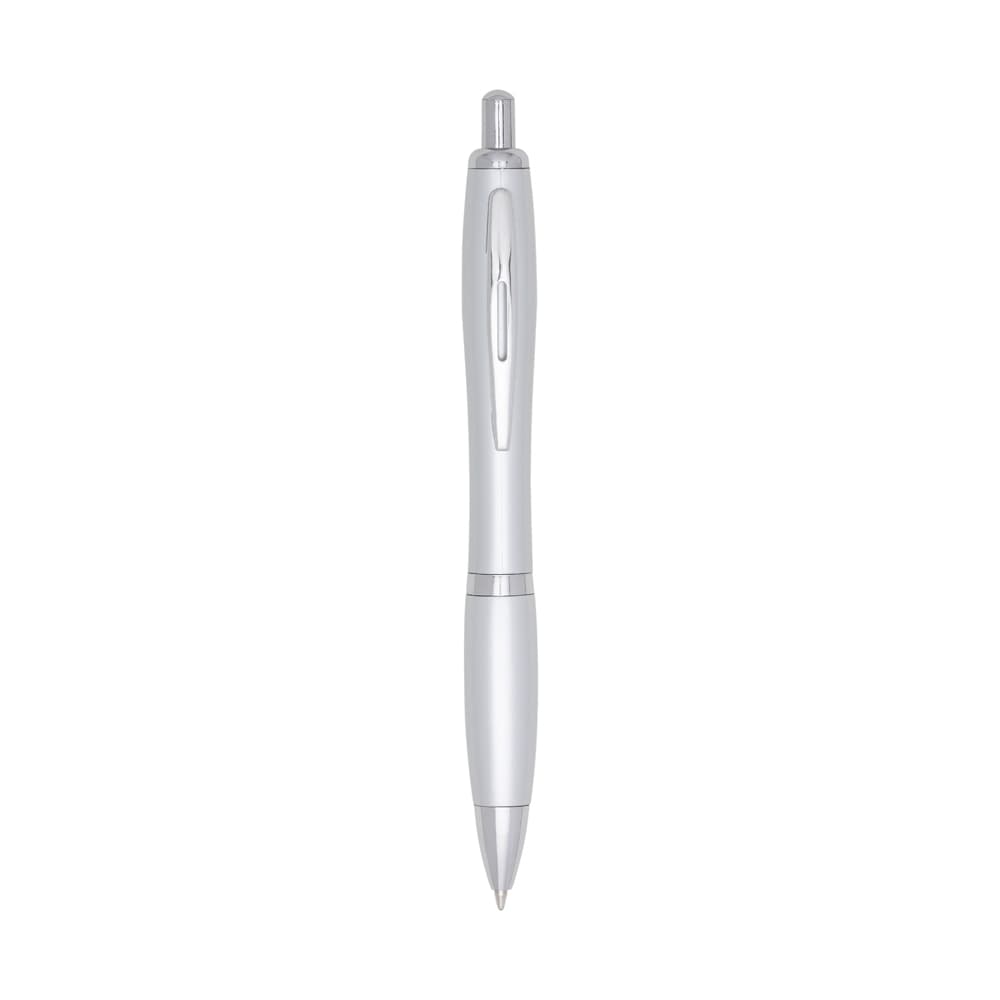 Caneta plástica com detalhe emborrachado, carga esferográfica azul 1.0 mm e acionamento por clique.