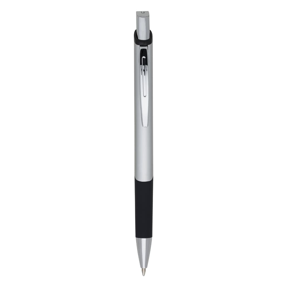 Caneta metálica com design quadrangular, acabamento brilhante (exceto a prata) e detalhe emborrachado, carga esferográfica azul 1.0 mm e acionamento por clique.