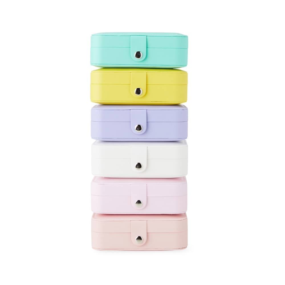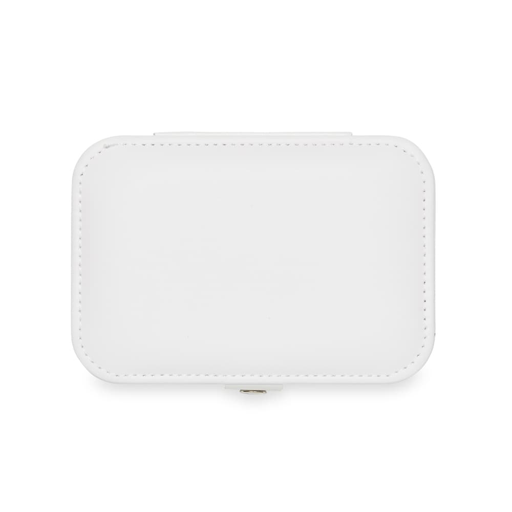 Porta-joias de couro sintético com revestimento aveludado. Possui compartimentos internos para anéis, pulseiras, colares e placa para brincos.
