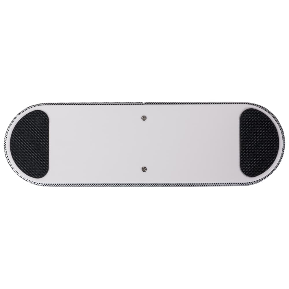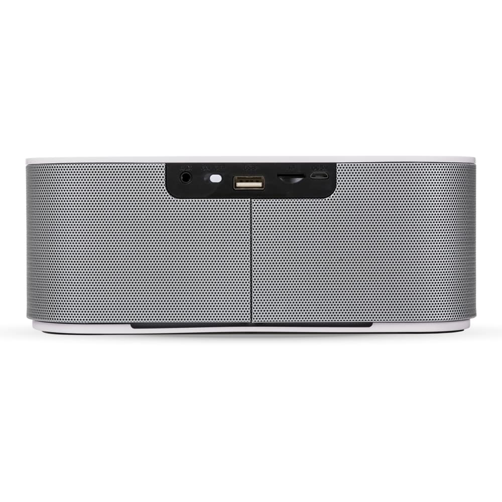 Caixa de Som Multimídia. Design fino e material plástico resistente, possui: botão On/Off no verso, botão >|| (MODE), botão < retroceder faixa ou diminuir volume, botão > avançar faixa ou aumentar volume, botão PLAY/PAUSE e atender chamadas, entrada P2/auxiliar(caixinha de som pode ser conectada no computador, basta segurar o botão central para alternar o modo), entrada microUSB, microfone, entrada microSD(cartão de memória) e entrada USB(leitura de pen drive), parte inferior possui borrachas anti deslizantes e auto-falantes laterais. Acompanha cabo USB.