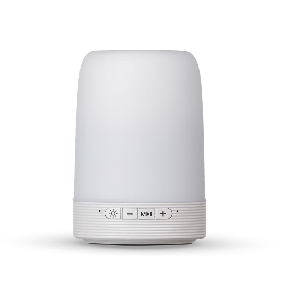 Caixa de som multimídia com luzes, suporte para celular e porta caneta. Material plástico resistente na cor branca fosca, parte superior com falante vazado na área interna, pode ser utilizado como porta caneta ou suporte para celular. Parte inferior branca leitosa com linhas em relevo, borracha inferior anti deslizante e alça de alumínio.