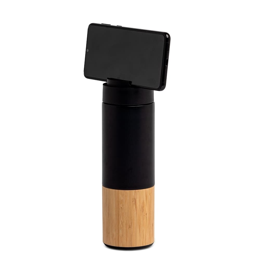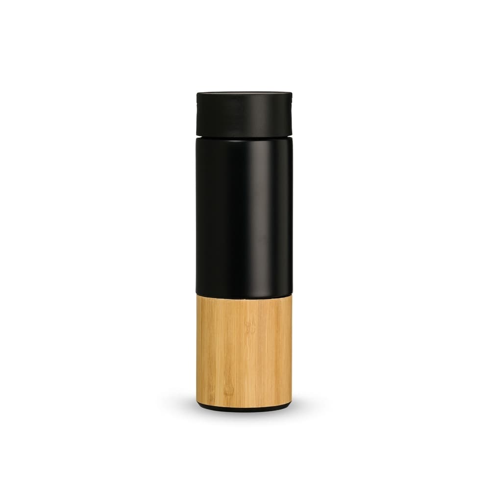 Garrafa térmica produzida em inox 304 com capacidade de 420ml, acompanha peneira para infusão de bebidas. Com detalhes em bambu e plástico, sua tampa é livre de BPA e possui uma alça para transporte que também pode ser utilizada como suporte para celular.