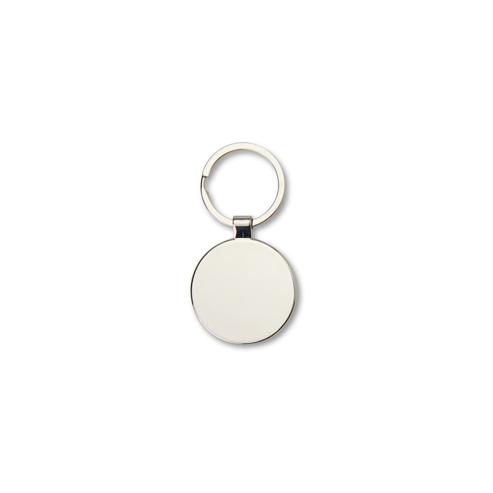 Chaveiro de metal redondo, frente com detalhe em bambu e verso liso.