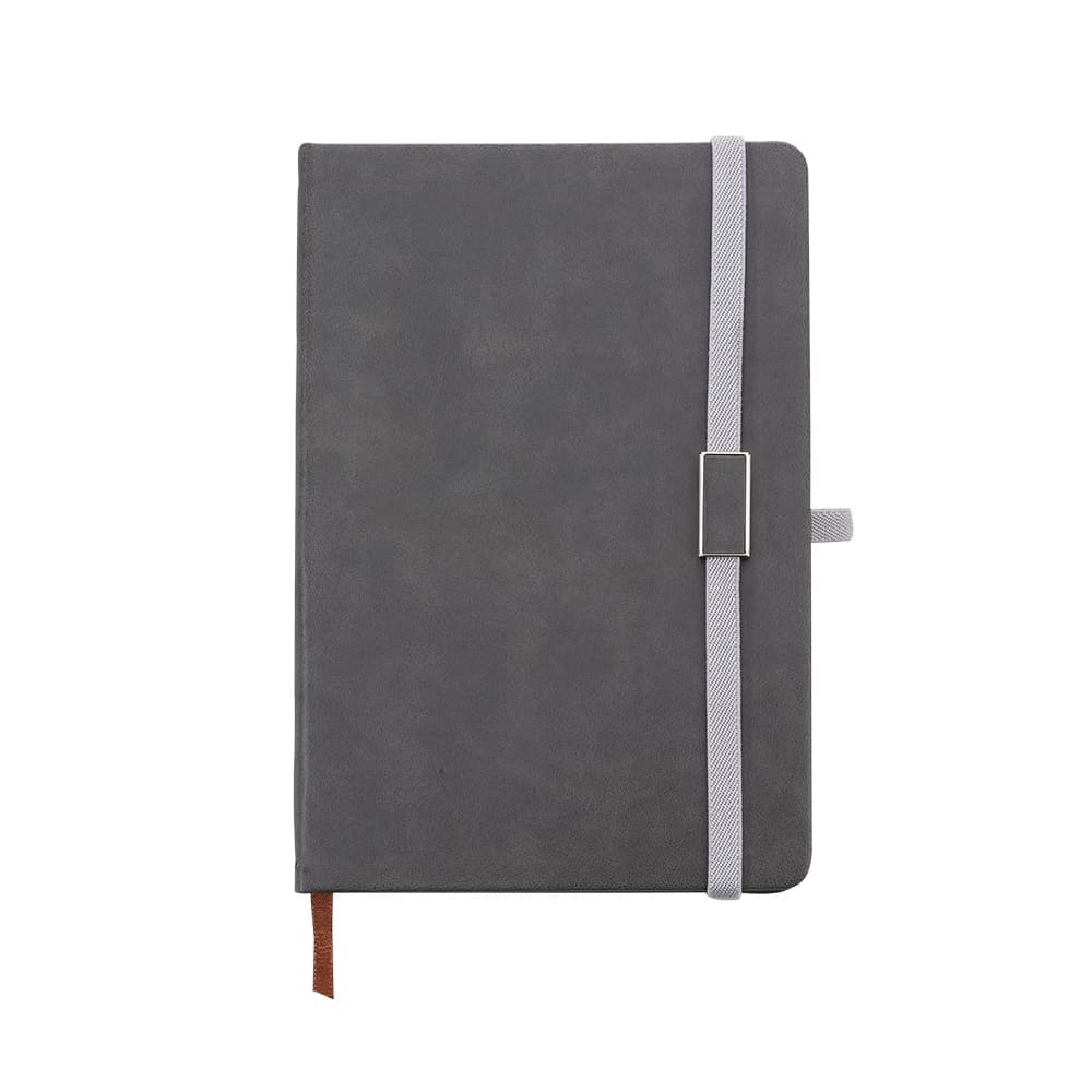 Caderneta emborrachada com suporte para caneta. Contém aproximadamente 96 folhas amarelas sem pauta, suporte de nylon para caneta (não acompanha), marcador de página em cetim e elástico para lacre com plaquinha de centro emborrachado.