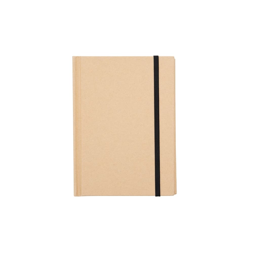 Caderneta ecológica, material em kraft. Frente e verso liso com fita elástica para fechar. Contém aproximadamente 80 folhas amareladas sem pauta.