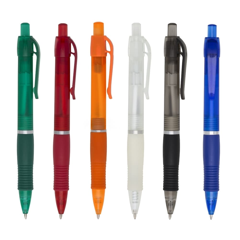 Caneta plástica com detalhe emborrachado, carga esferográfica azul 1.0 mm e acionamento por clique.