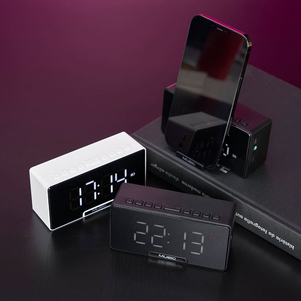 Caixa de som multimídia com relógio despertador e suporte para celular. Produzida em plástico e com borrachas antiderrapantes na área inferior, a caixa de som tem a área frontal com display de LED, além de um compartimento com suporte para celular – uma espécie de “gaveta” aonde é exibido (MUSIC), basta puxá-la ter acesso ao compartimento. A caixa de som executa nos modos bluetooth, cartão TF-microSD e entrada auxiliar P2. Acompanha cabo USB e manual em inglês.