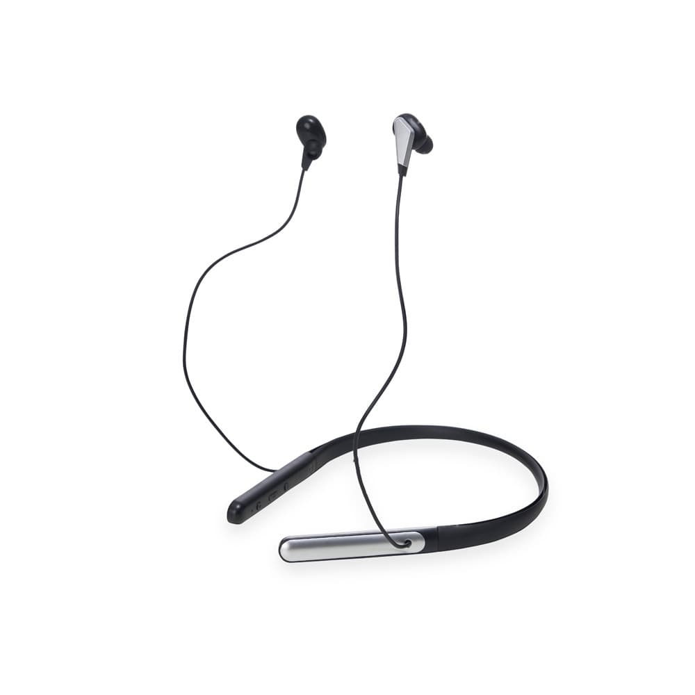 Fone de ouvido bluetooth com haste para pescoço. Possui microfone para atendimento de chamadas telefônicas, botões liga/desliga, + e – na haste, acompanha USB.