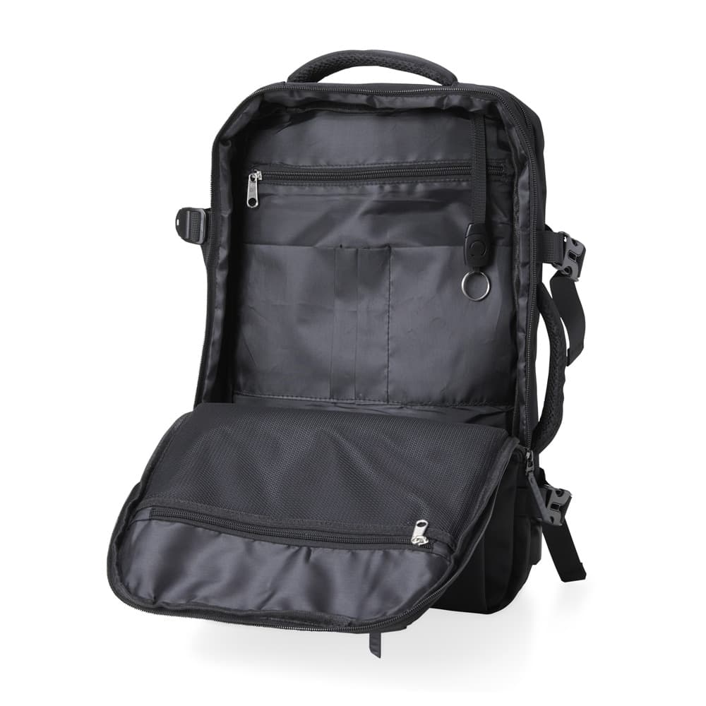 Mochila de nylon 20 litros com quatro compartimentos, sendo o principal com bolso para notebook 15,6 e tablet 12,4. Com divisórias internas para acessórios e porta chave, a mochila possui adaptador USB externo, alça para encaixe em malas de viagem, alças de compensação, duas alças de mãos, área costada com revestimento espumado e alças para as costas com faixas refletivas e revestimento espumado.