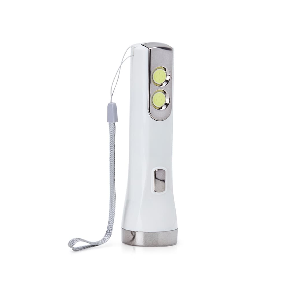 Lanterna plástica recarregável de um led com 3 estágios de iluminação e dois leds lateriais com função luminária. Possui cordão de nylon para transporte e acompanha cabo usb.