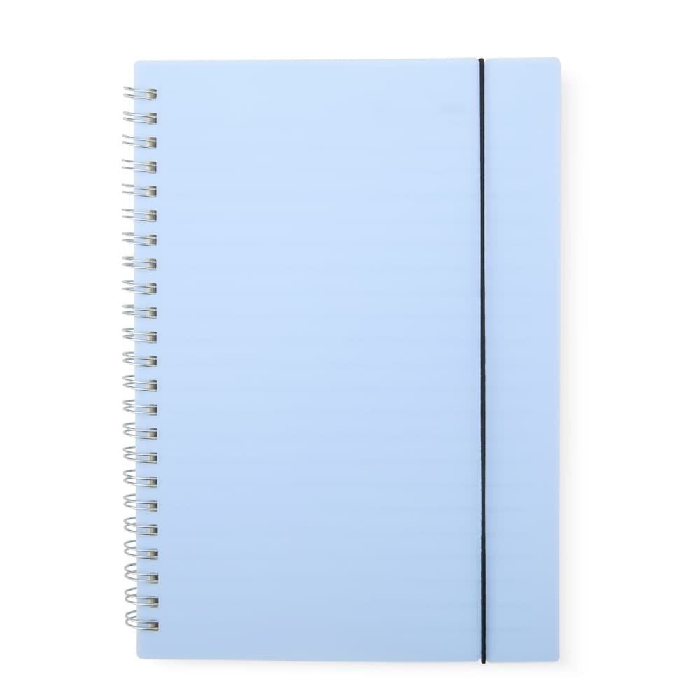 Caderno A5 com capa plástica e elástico para lacre, contém aproximadamente 80 folhas marfim com pauta.