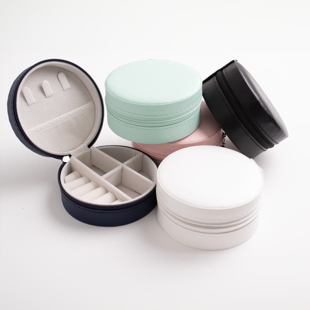 Porta-joias de couro sintético com revestimento aveludado. Possui compartimentos internos para anéis, brincos, pulseiras e colares.