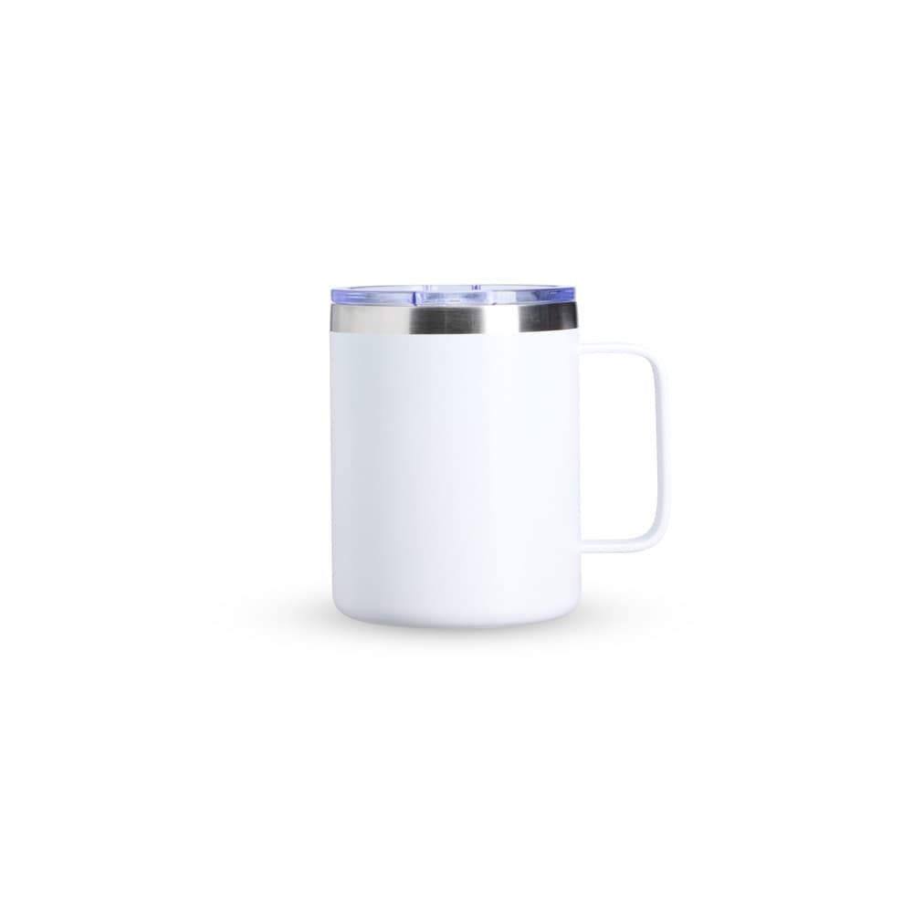 Caneca térmica de inox 350ml com parede dupla. Contém tampa acrílica com bocal e trava de segurança.