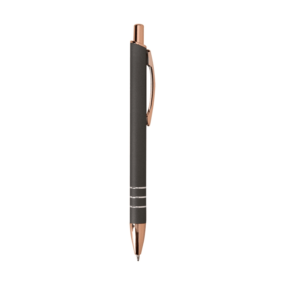 Caneta metálica com acionamento por clique e carga esferográfica azul de 1.0mm, uma combinação que oferece pegada leve para uma escrita mais precisa.