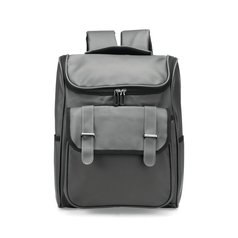 Mochila confeccionada em couro sintético impermeável com capacidade de até 18 litros. Possui compartimento interno para notebook de até 13 polegadas. Apresenta compartimento frontal com par de fivelas e fechamento em botões magnéticos, além de dois bolsos laterais. Possui área das costas e alças de mão e de costas com revestimento em tecido respirável.