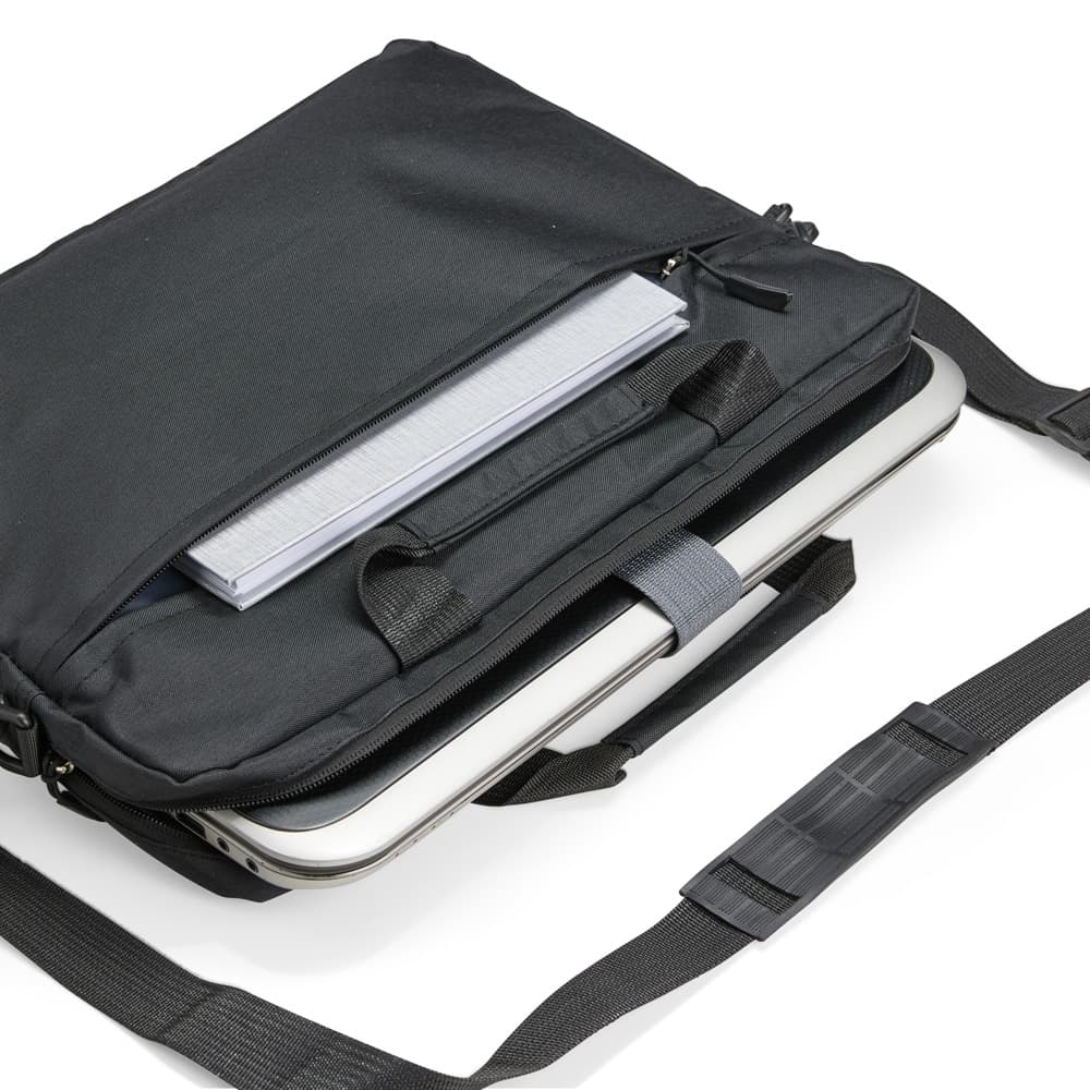 Produzida em poliéster resistente à água, esta pasta para notebook de 15 polegadas oferece durabilidade e segurança no transporte de dispositivos e documentos. Possui dois compartimentos, sendo o principal com bolso dedicado para notebook com fita elástica para fixação e revestimento espumado, proporcionando maior proteção contra impactos. Versátil, possui alça de engate para malas de viagem, alças de mão e alça transversal removível com encaixe de mosquetão, permitindo diferentes formas de uso.