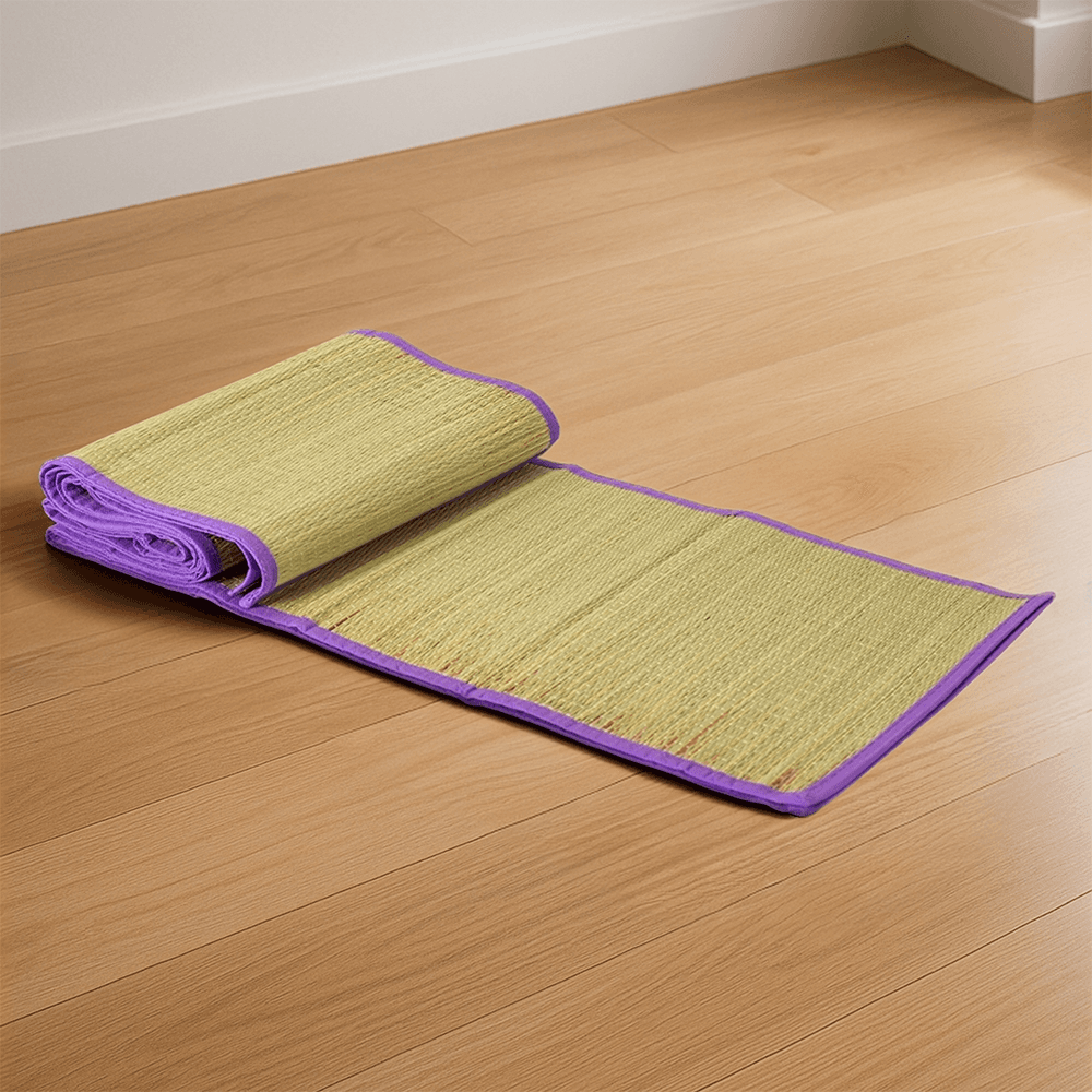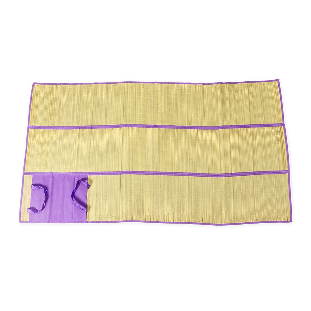 Esteira dobrável em palha sintética com bordas costuradas em nylon dividindo a esteira em três partes. Além disso, possui um par de alças costuradas para transporte.