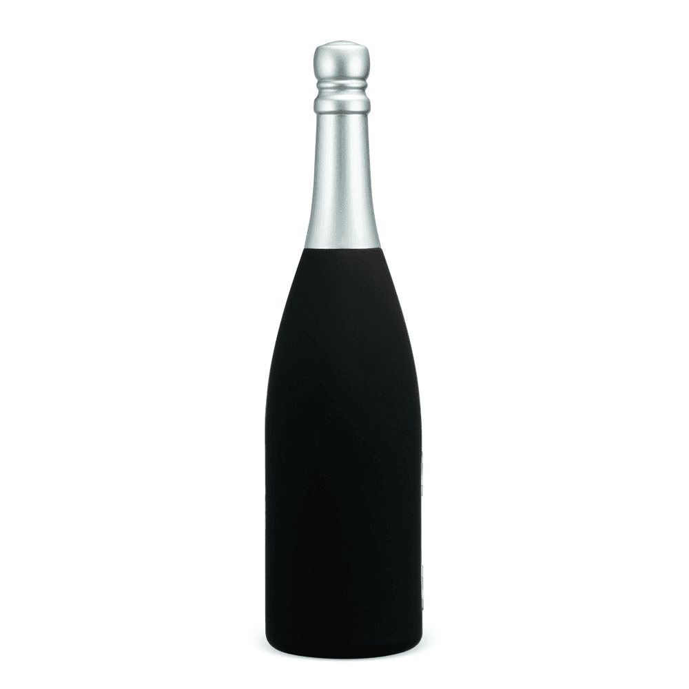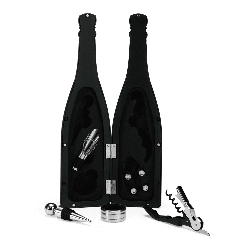 Kit vinho com cinco peças dispostas em um estojo no formato de garrafa, fechamento imantado e interior com berço em espuma. O conjunto contém: tampa de bico, bico condutor com tampa, saca-rolhas metálico três em um com lâmina de corte e abridor de garrafa, um wine collar e cortador de lacre.