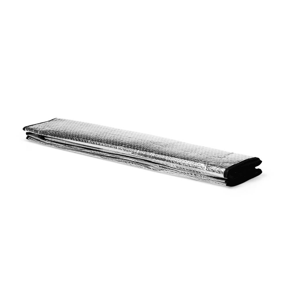 Protetor de para-brisa dobrável feito em alumínio reflexivo com bordas em nylon e um par de elásticos fixos que mantêm o protetor dobrado fora de uso. Acompanha duas ventosas para fixação no vidro do carro.
