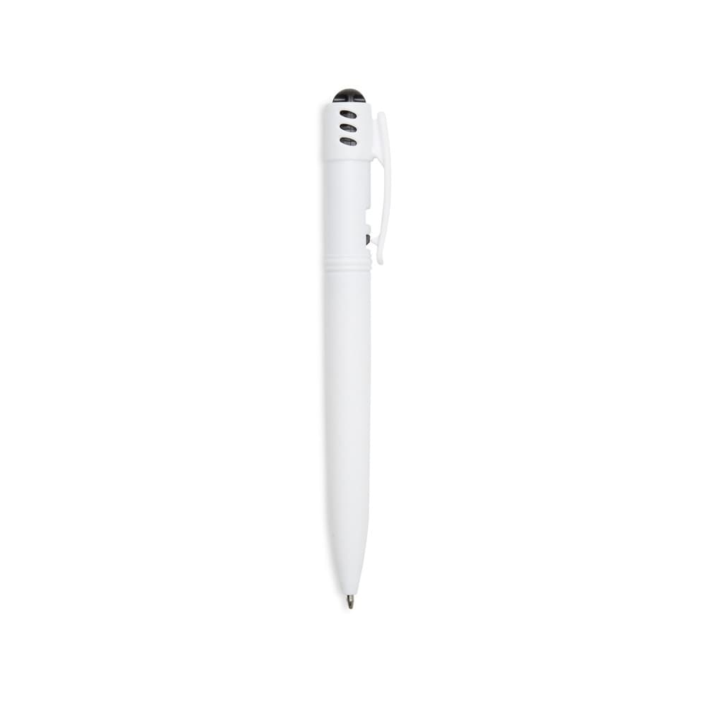 Caneta plástica com carga esferográfica azul e acionamento por clique.