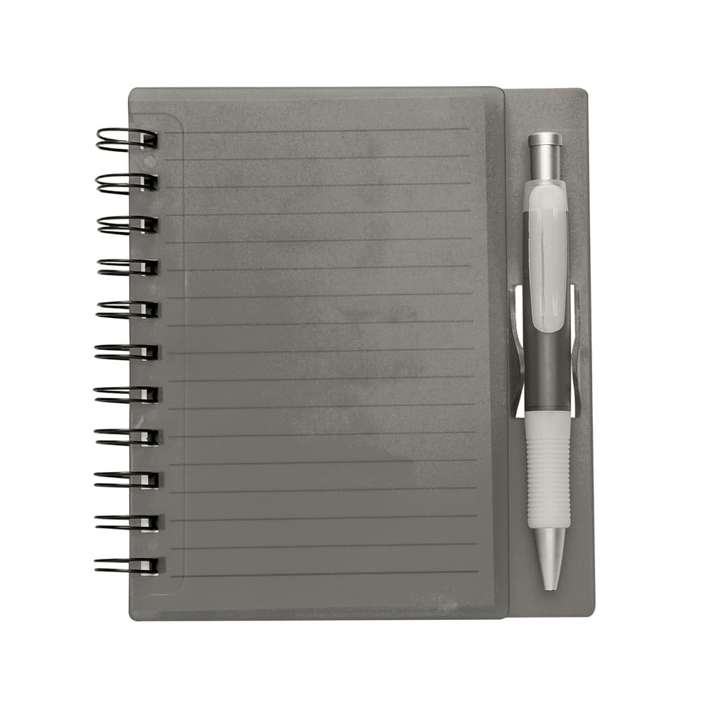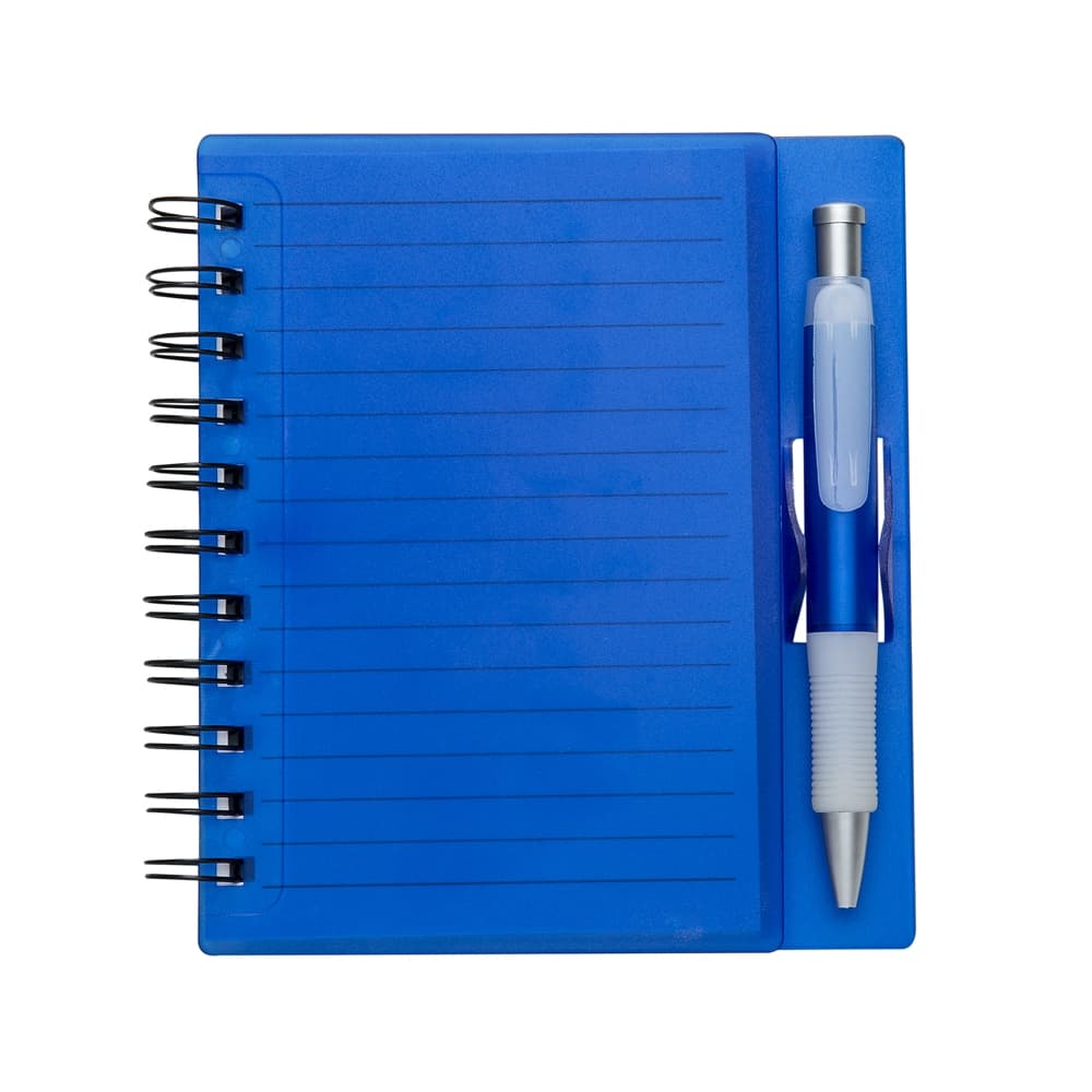 Caderno plástica wire-o com caneta e suporte para encaixe. Caneta plástica com detalhe emborrachado, carga esferográfica na cor azul e acionamento por clique.