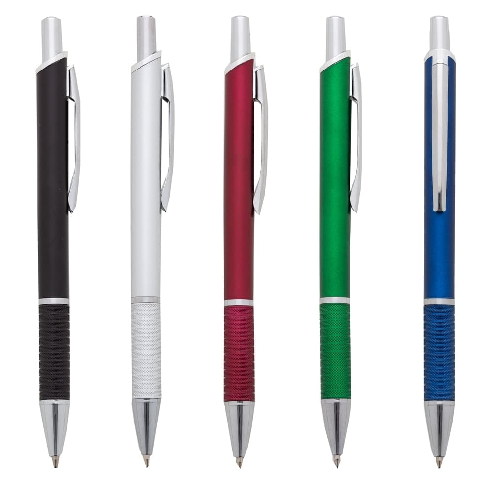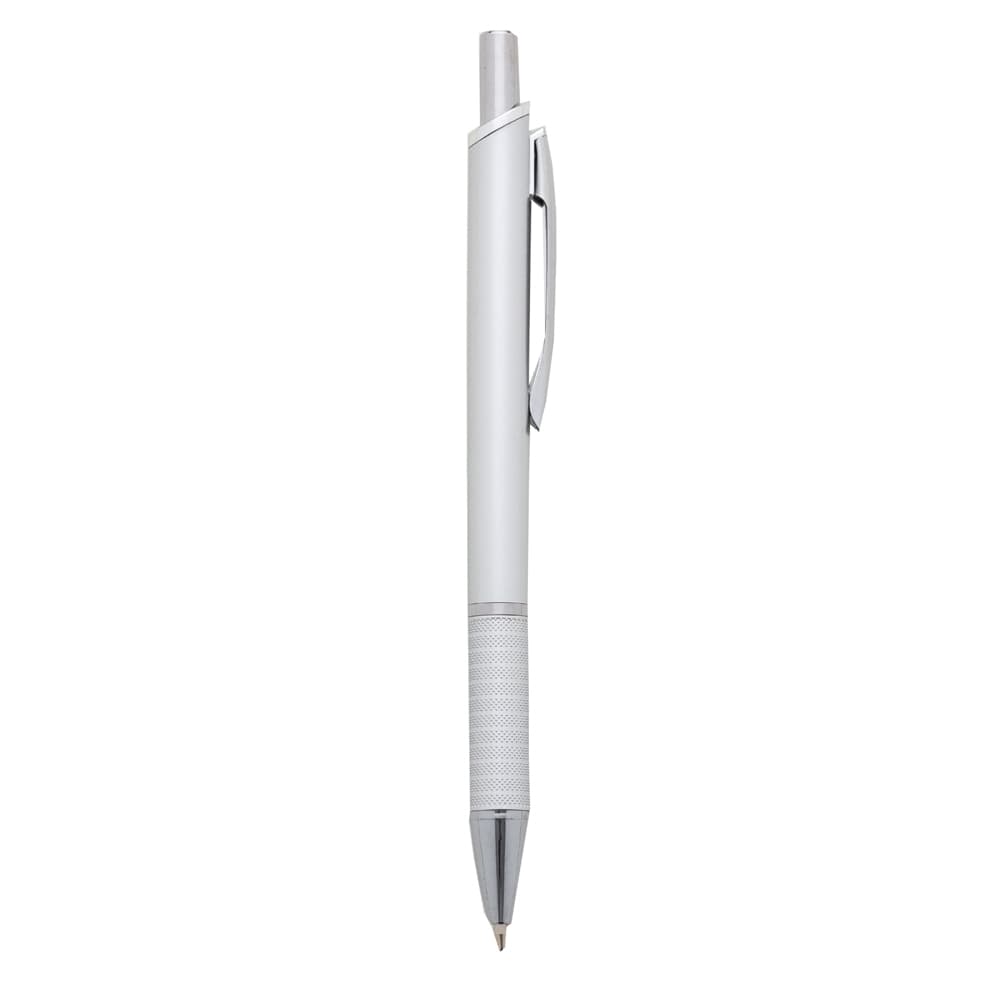 Caneta plástica com carga esferográfica azul 1.0 mm e acionamento por clique.