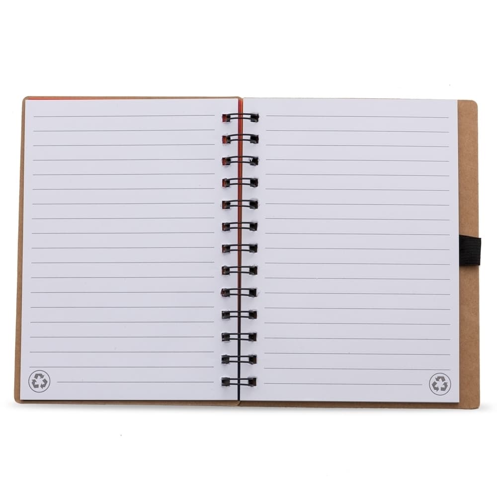 Caderno ecológico com símbolo reciclado na capa, acompanha folhas coloridas estilo folhas de guarda nas cores: vermelho, amarelo, laranja, azul, verde e preto, possibilitando selecionar a cor desejada como fundo do logo reciclado. Possui aproximadamente 70 folhas brancas pautadas com logo reciclado na lateral inferior das folhas, possui também elástico suporte para caneta(não acompanha caneta).