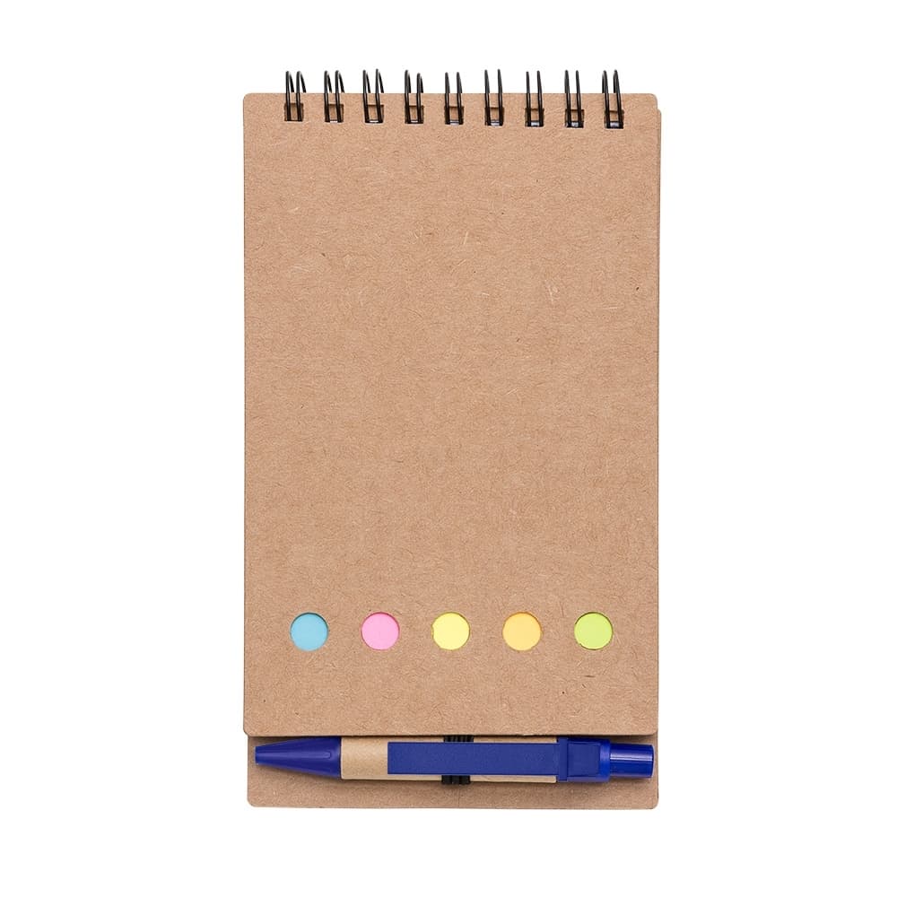 Bloco de anotações ecológico com autoadesivos e mini caneta. Bloco com wire-o e detalhes vazados na capa, contém conjunto de cinco bloquinhos autoadesivos coloridos, bloco autoadesivo pequeno, miolo com folhas pautadas e suporte de nylon com mini caneta de papelão com carga esferográfica na cor azul e acionamento por clique..
