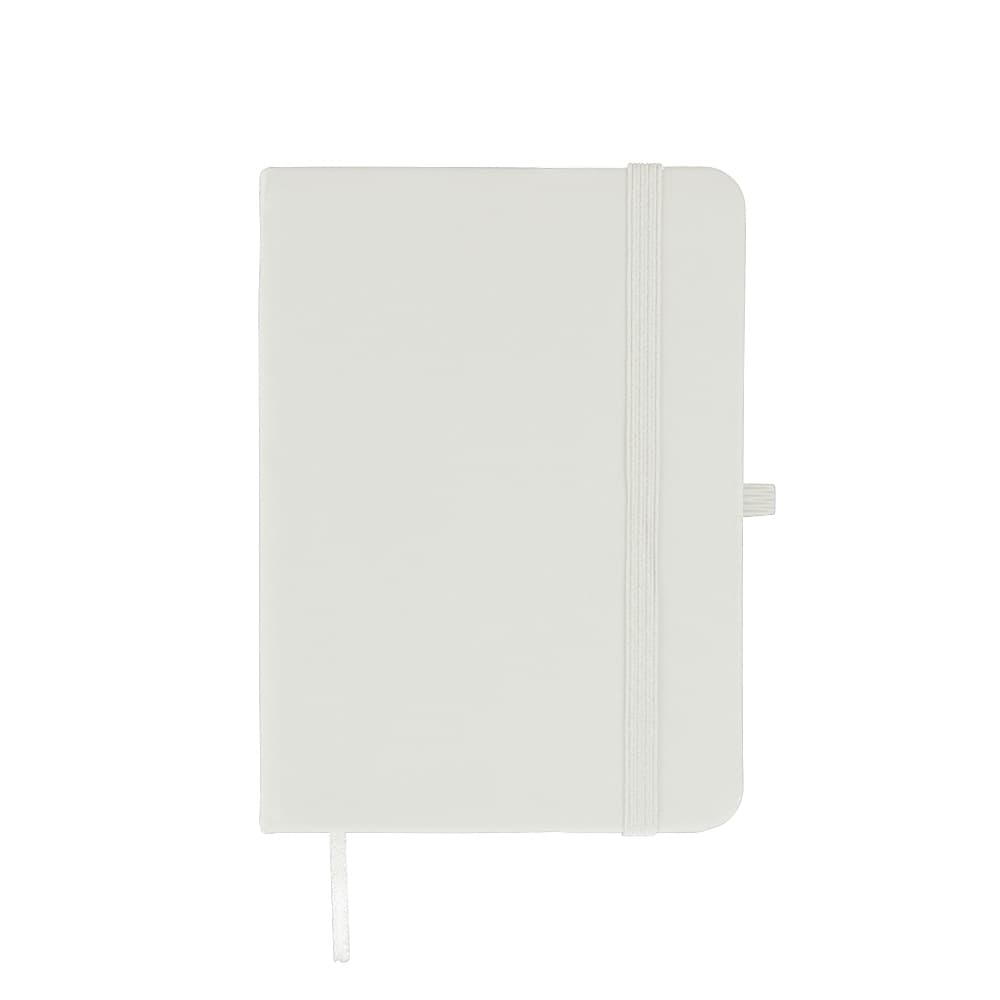 Caderneta emborrachada com elástico para lacre, marcador de página em cetim e porta caneta, contém aproximadamente 84 folhas marfim sem pauta.