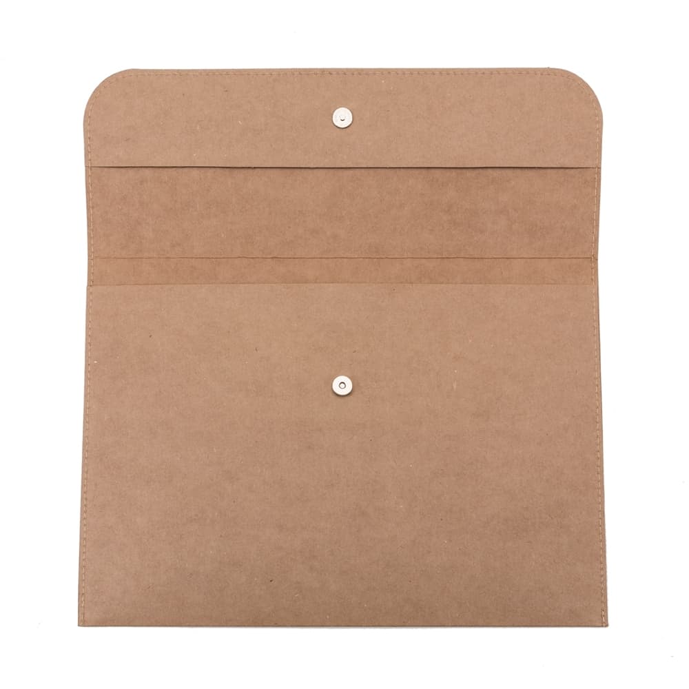 Pasta envelope ecológica, possui abertura superior fixada por um botão imantado. Detalhes costurados nas laterais, material em kraft.