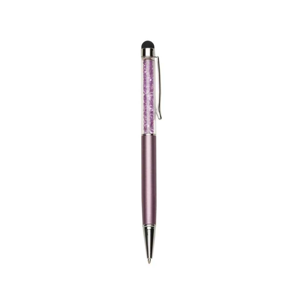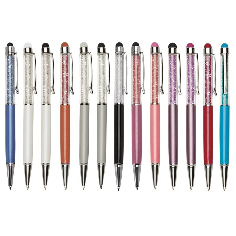 Caneta metálica com touch screen e detalhes em cristal, carga esferográfica azul e acionamento por rotação.