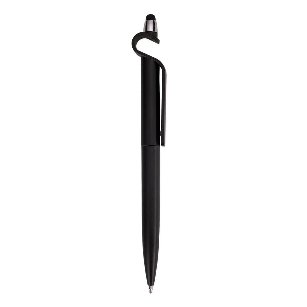 Caneta plástica com suporte para celular e touch screen. Carga esferográfica azul 1.0 mm e acionamento por rotação.