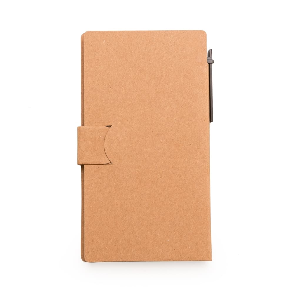 Bloco de anotações ecológico com caneta reciclada. Possui uma trava na própria capa, caneta de papelão com acabamentos em plástico acionada por clique, cinco blocos autoadesivos coloridos com aproximadamente 20 folhas cada, bloco de autoadesivo amarelo com aproximadamente 20 folhas e bloco com aproximadamente 50 folhas brancas sem pauta.