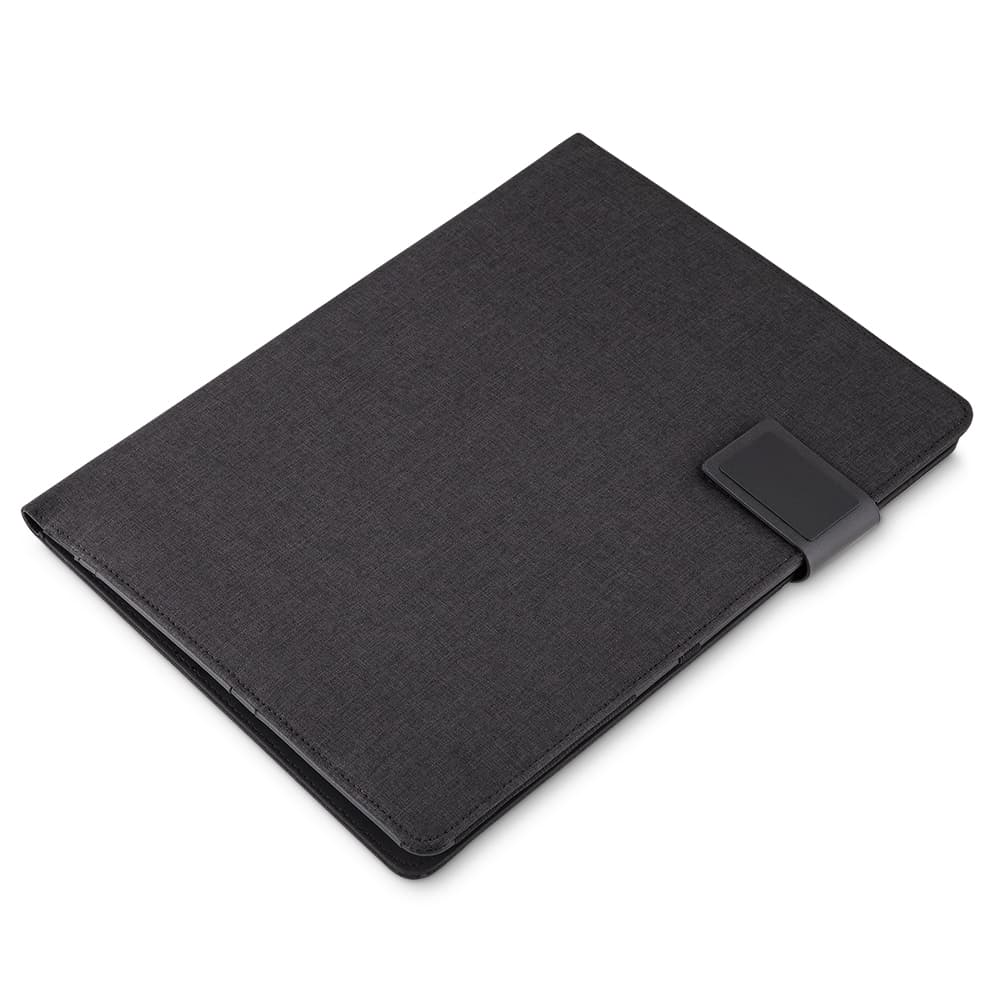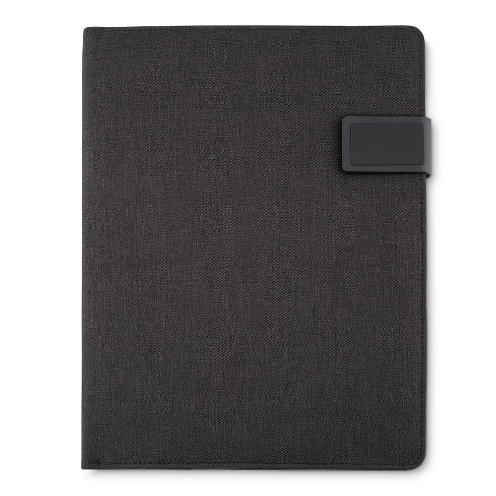 Pasta convenção de tecido sintético, possui fecho magnetizado com plaquinha para personalização em preto fosco. Parte interna com compartimento grande para arquivar documentos,três divisórias elásticas, duas divisórias para celular e cartões, suporte elástico para caneta e bloco com aproximadamente 20 folhas brancas pautadas com dias do mês na área superior.
