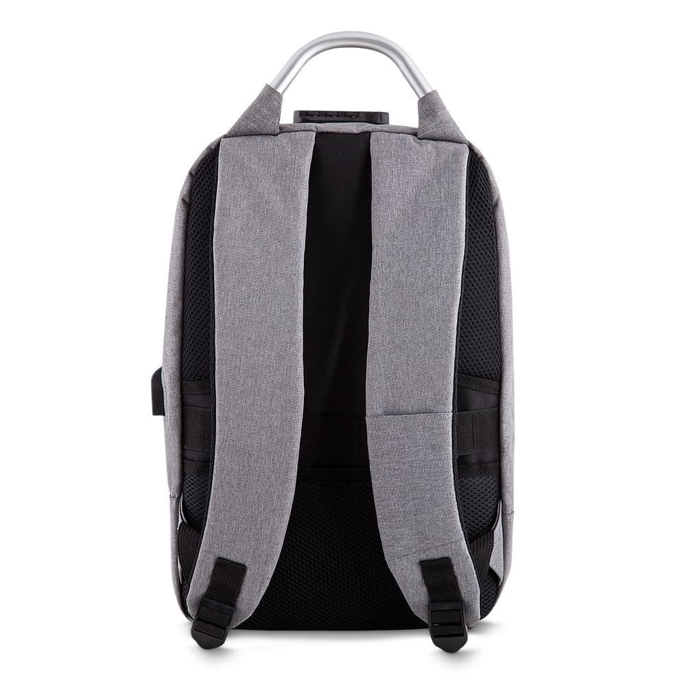 Mochila anti-furto com cadeado de segredo. Material de poliéster cinza, tem a parte frontal à prova d’água (respingos). Compartimento principal com bolso para notebook e bolso de tela, parte externa com cadeado de segredo para trava dos zíperes; bolso médio com pequenas divisórias e bolso frontal com fita reflexiva. Possui entrada para fone de ouvido, suporte com entrada USB na parte externa e cabo USB acoplado internamente; permitindo a conexão de um carregador portátil na área interna e a conexão de um eletrônico na área externa, viabilizando a carga e utilização do eletrônico enquanto caminha. Alças para as costas ajustáveis revestidas com espuma para um maior conforto, alça para mãos em metal e alça horizontal para encaixe em malas de viagem. Utilização do cadeado: para criar um segredo pressione e segure o botão, crie a numeração desejada e em seguida solte o botão para assumir a codificação criada, repita o mesmo processo sempre que necessitar fazer alguma alteração.