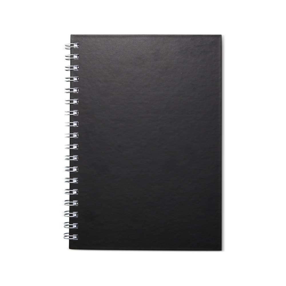 Caderno percalux emborrachado com espiral metálico. Possui aproximadamente 94 folhas brancas pautadas e páginas para: dados pessoais, calendário de 2024 à 2027 e planejamento.