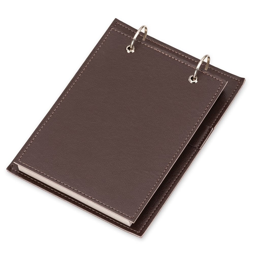 Bloco de anotações de mesa com trilho de ferro, capa em couro sintético. Possui suporte na lateral interna para colocar caneta (não acompanha) e aproximadamente 96 folhas recicladas com área destacável.