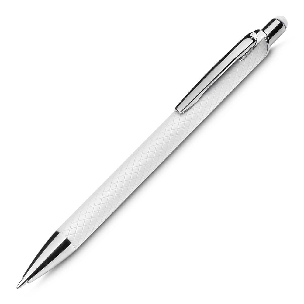 Caneta touch screen em alumínio reciclado com acabamento similar à borracha e corpo texturizado. Acionamento por clique e carga esferográfica azul 1.0mm.