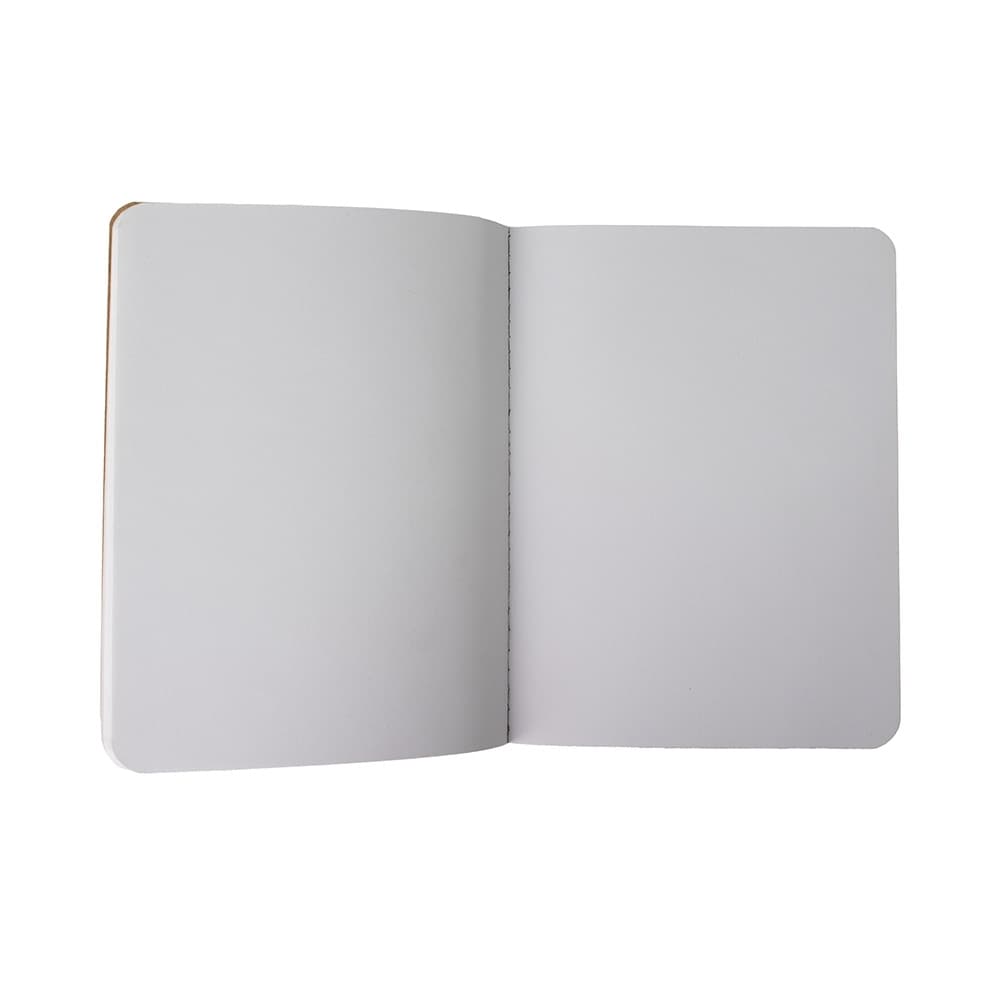 Caderneta em material kraft, frente e verso liso com fita elástica para fechar. Contém aproximadamente 70 folhas brancas sem pauta.