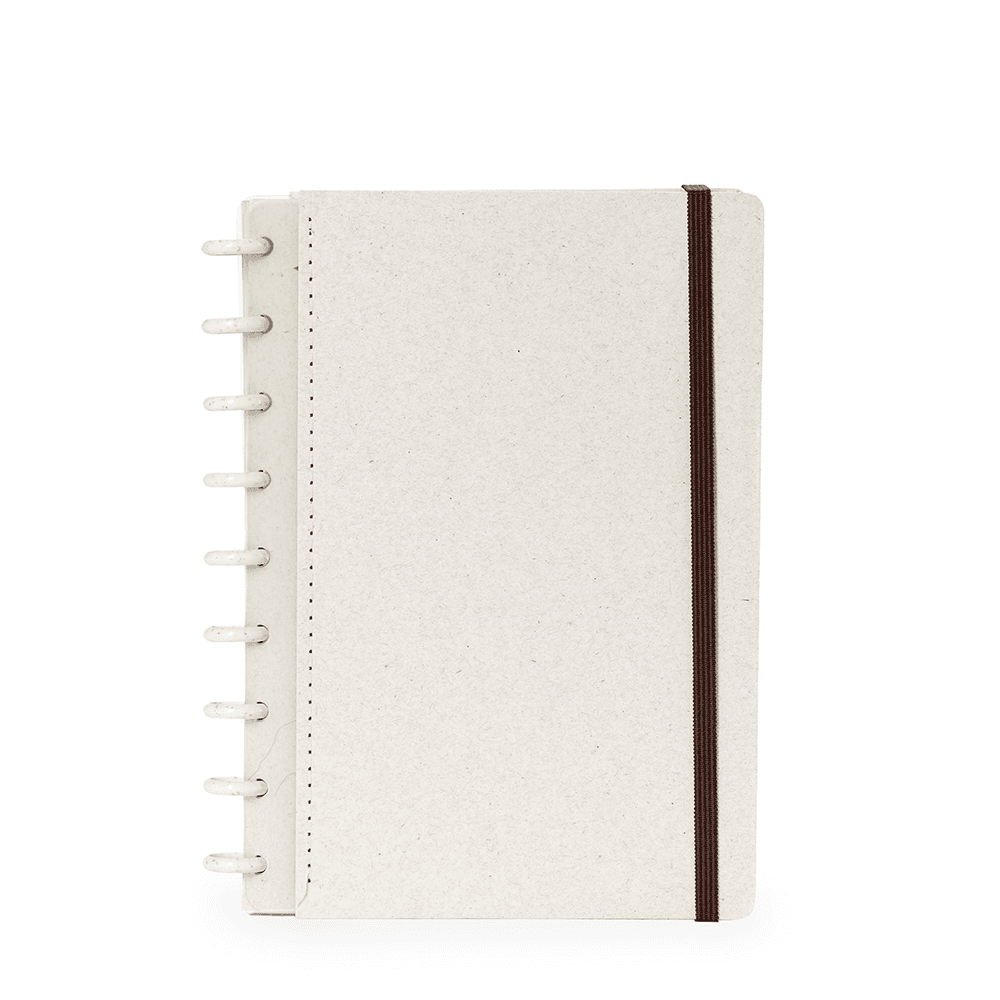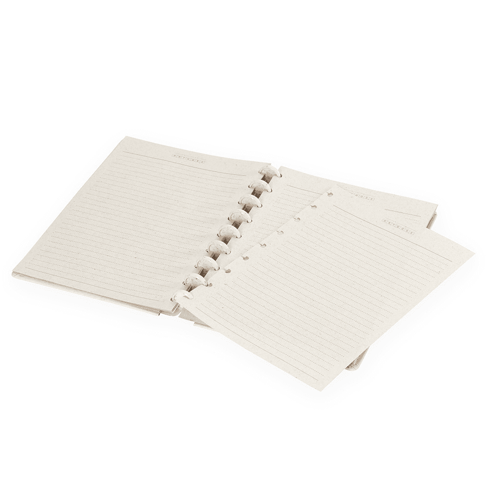 Caderno de capa dura em papel reciclado, com fechamento em elástico e encadernação em discos de fibra de arroz, que permitem adicionar ou retirar folhas compatíveis. Possui páginas dedicadas para dados pessoais, calendários de 2025 e 2026 e um manual para troca e retirada de folhas. Possui cerca de 80 folhas em papel reciclado pautadas.