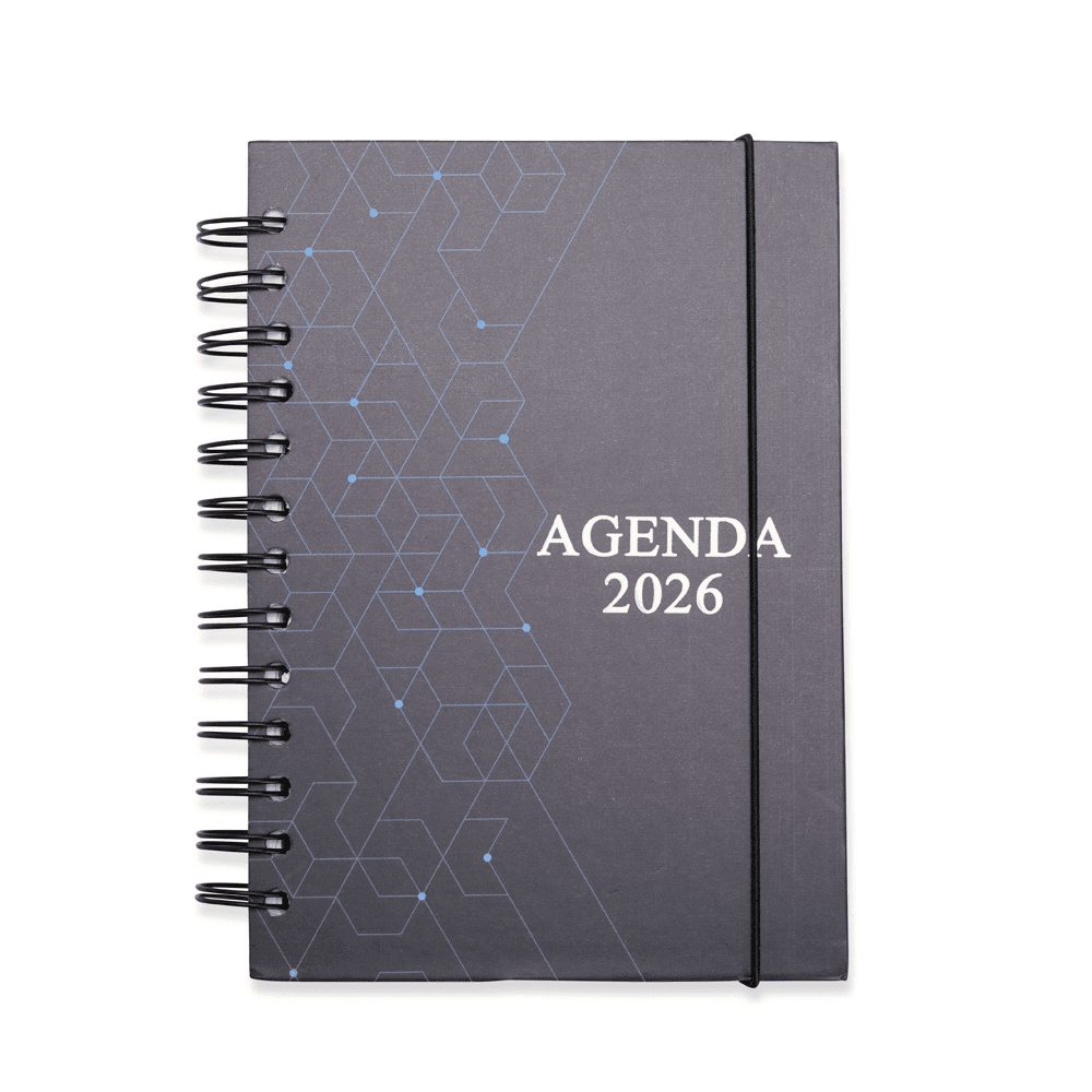 Agenda diária em capa dura, encadernação Wire-O, elástico de fechamento e marca-páginas em cetim. Contém ainda páginas dedicadas a dados pessoais, calendários de 2026 a 2028, planejamento mensal e lista de contatos.