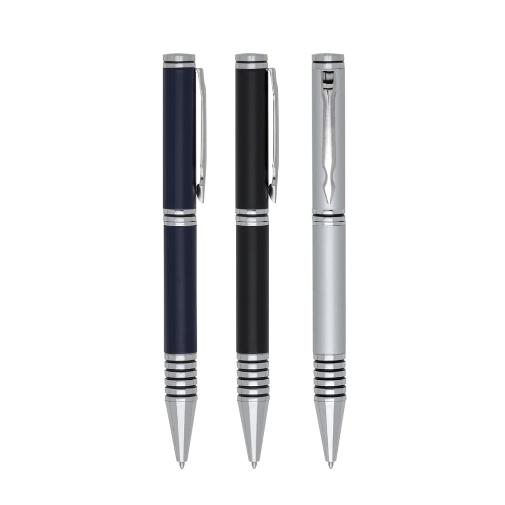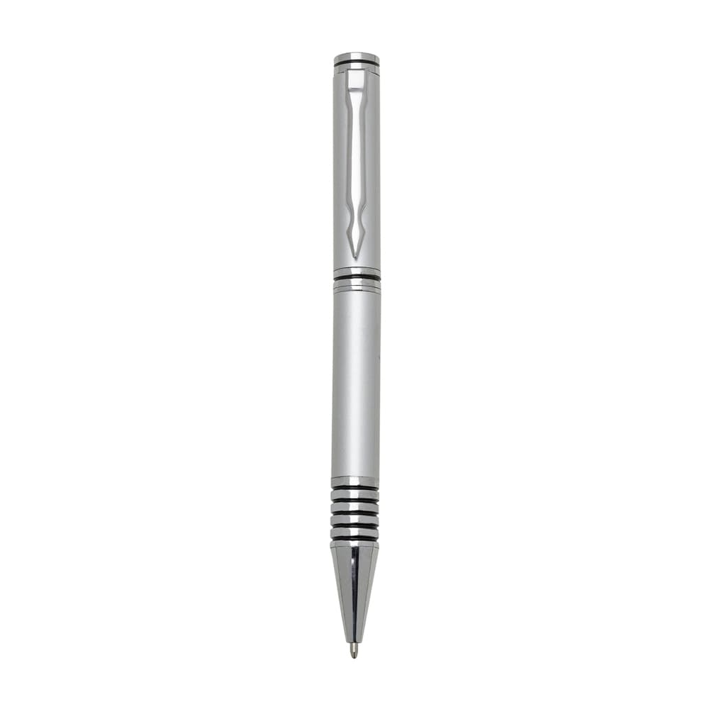 Caneta metálica com carga esferográfica azul e acionamento por rotação.