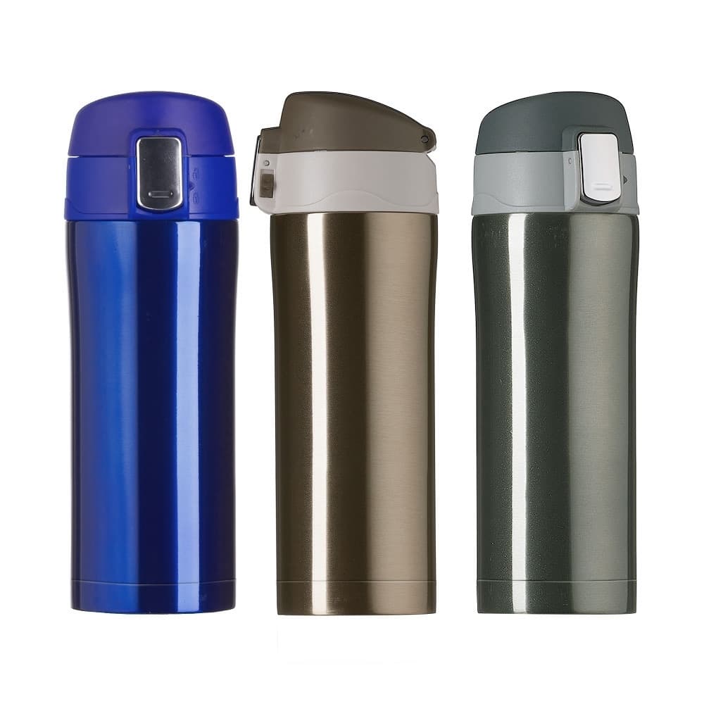 Garrafa térmica 350ml colorida com sistema de trava. Material metálico com revestimento interno em inox, possui tampa plástica fosca com borracha interna para vedação evitando o vazamento de líquido e prezando sua temperatura; possui botão central para abertura e trava lateral(basta seguir a orientação dos desenhos de cadeados simulando o travamento/destravamento da tampa).
