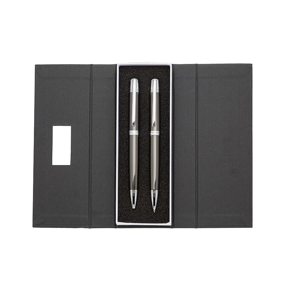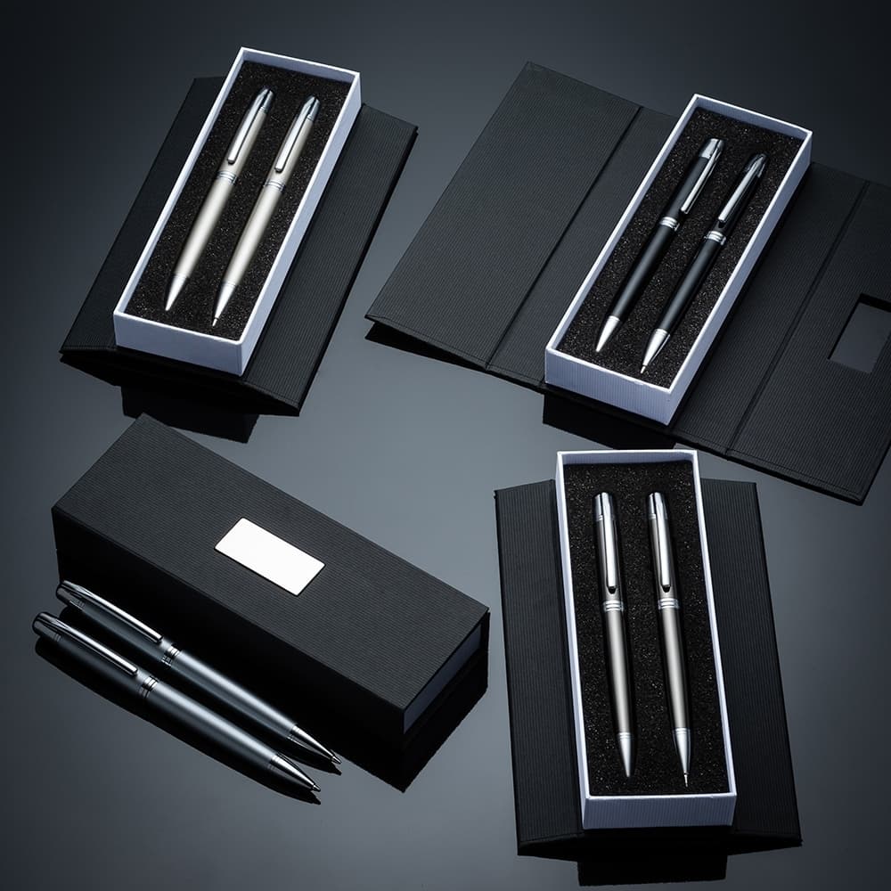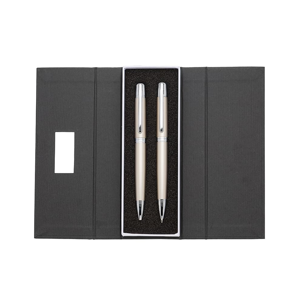 Conjunto caneta e lapiseira em estojo de cartonagem com placa central para personalização. Clip metal com dois anéis em relevo, anel centralizado e dois anéis em relevo na ponteira e acionam por giro. Estojo revestida com espuma na parte interna.