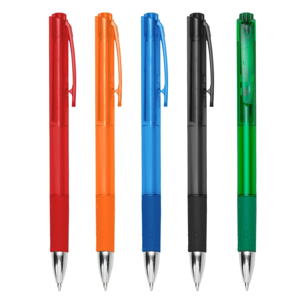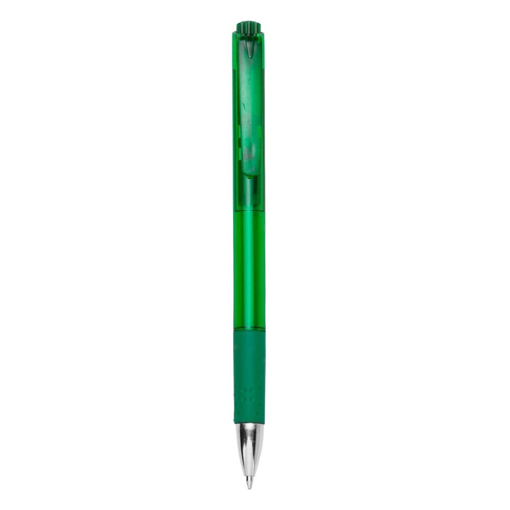 Caneta plástica translúcida colorida com detalhe inferior emborrachado. Aciona por clique e é destravado pressionando a parte inferior do clip.