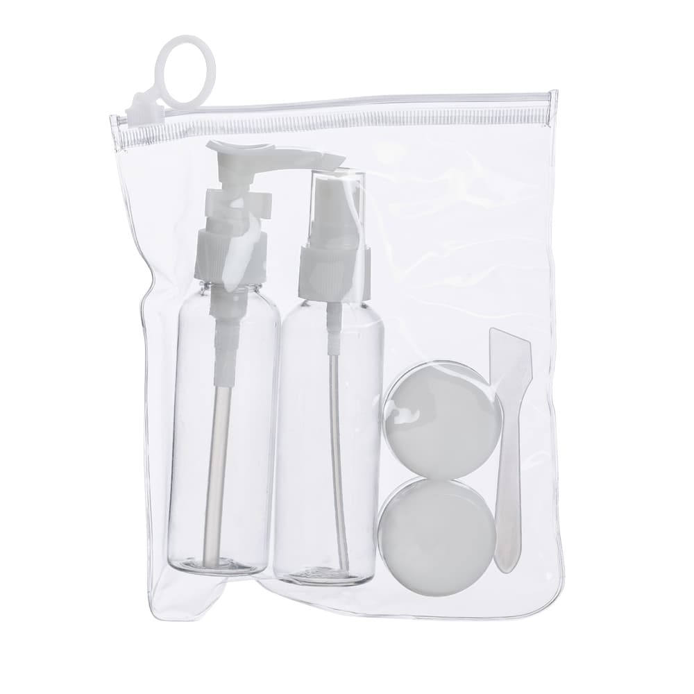 Kit viagem 5 peças em estojo ziplock. Contém frasco de 70ml com tampa spray; frasco de 70 ml com tampa pump; 2 potes de 10ml com tampa rosqueável e mini espátula fosca. Frascos plásticos e estojo em pvc com puxador plástico.