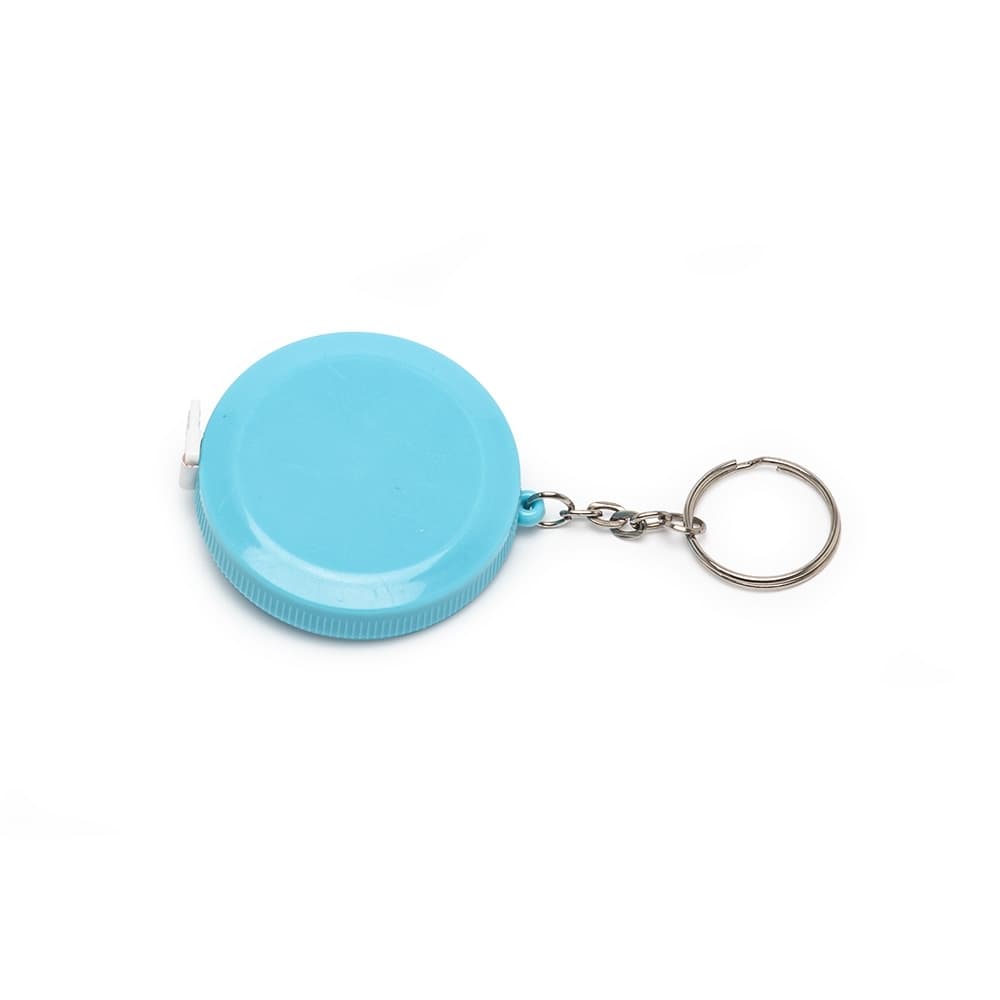 Fita métrica de 1,50 metro em plástico redondo, frente lisa e verso com botão (trava). Acompanha chaveiro.