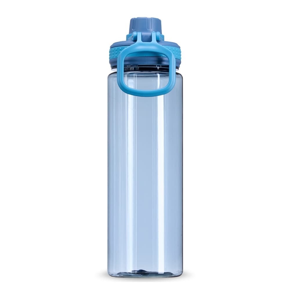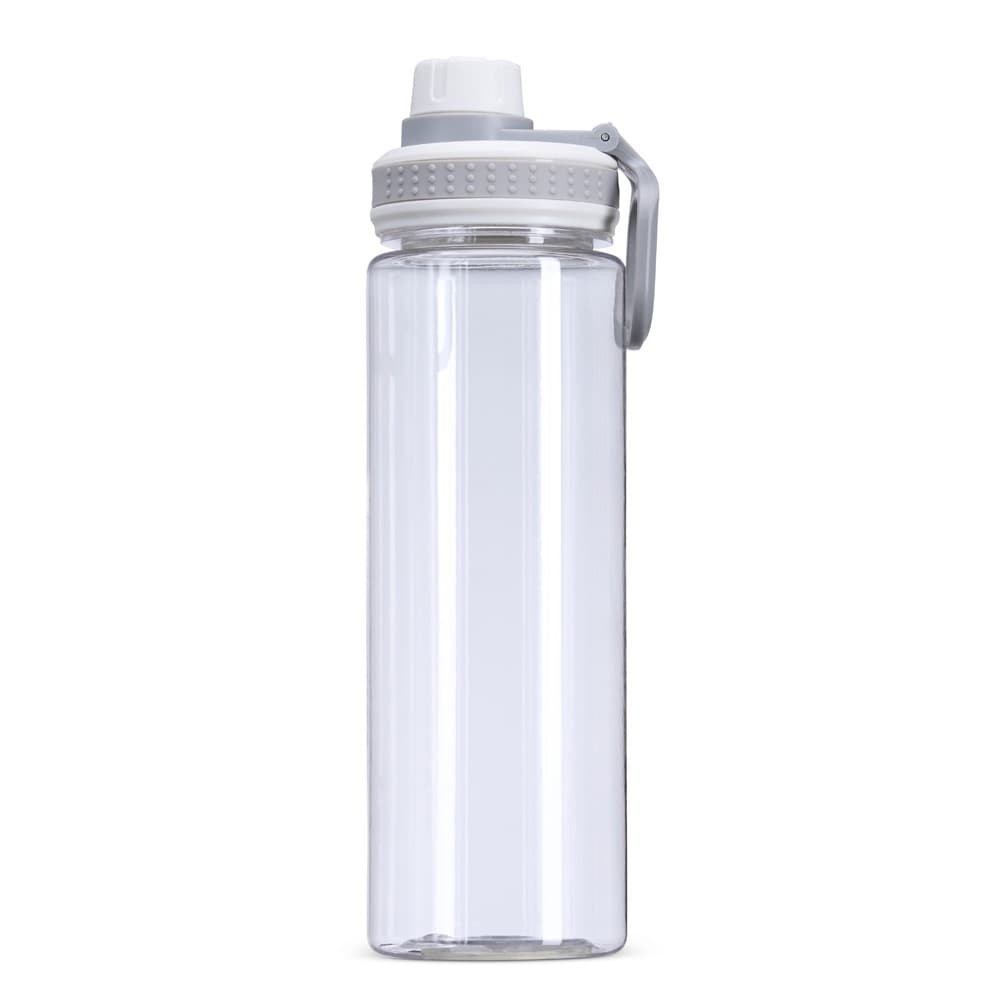 Garrafa plástica de 750ml com tampa rosqueável e bocal, tampa protetora e alça para facilitar o transporte.