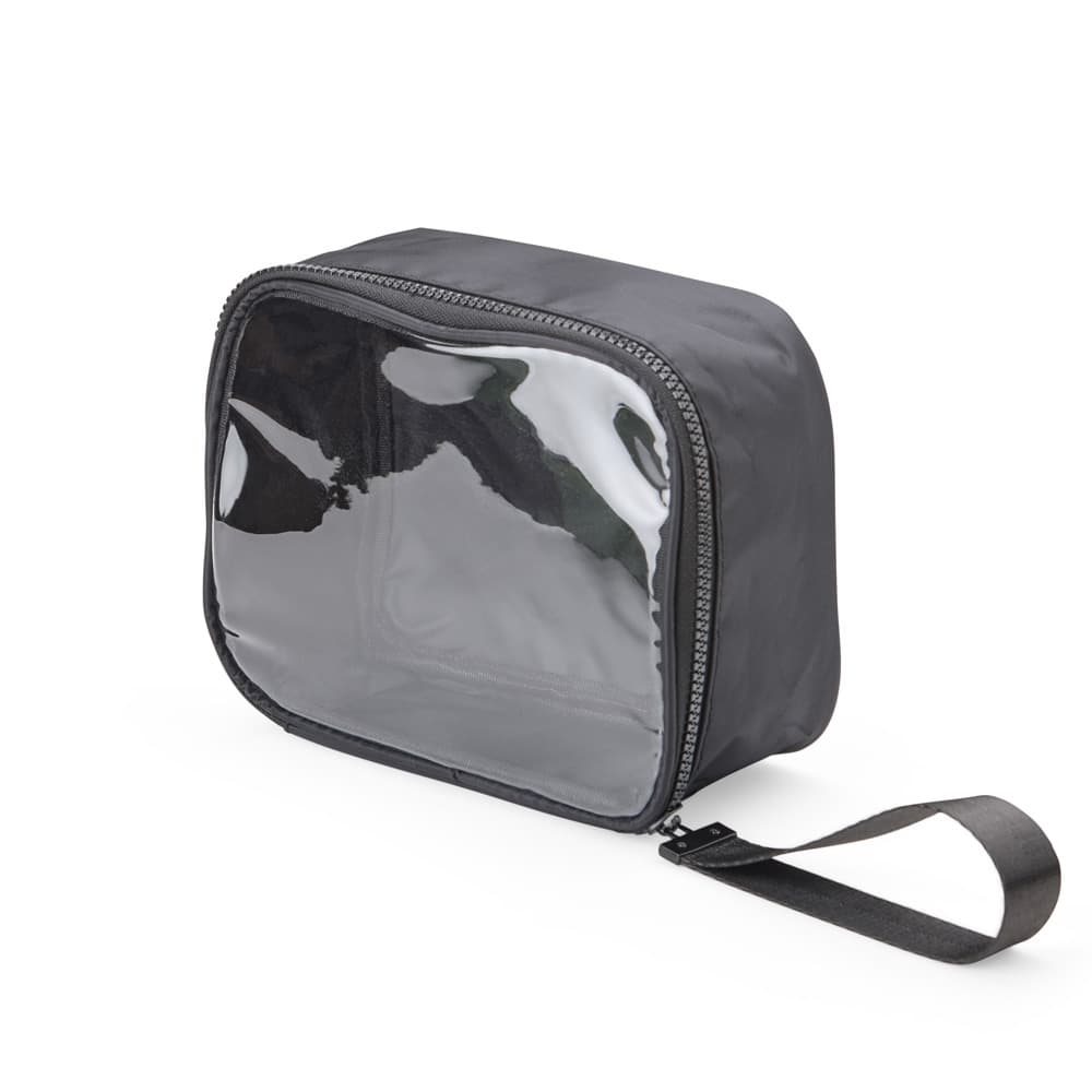 Nécessaire confeccionada em nylon, com frente em visor transparente, fechamento por zíper e alça superior. Inclui também uma alça de transporte em nylon.